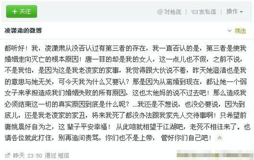 25日晚23:50,凌潇肃写微博公开:“唐一菲的确是我的女人。”他表示从没否认过第三者的存在,但不承认是因为第三者导致婚姻灭亡。凌同时透露,唐一菲站出来澄清,是他的意思,与唐无关。